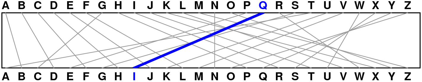 REFLECTOR_PERMUTATION = "IXUHFEZDAOMTKQJWNSRLCYPBVG"When the current leaves the reflector, it makes its way backward from left to right, starting with the slow rotor, moving on to the medium rotor, and finally passing through the fast rotor to arrive at one of the lamps. The complete path that arises from pressing Q is illustrated in Figure 3. As you can see from the diagram, the current flows through the fast rotor from right to left to arrive at I (index 8), through the medium rotor to arrive at X (index 23), and through the slow rotor to arrive at R (index 17). It then makes a quick loop through the reflector and emerges at S (index 18). From there, the current makes its way backward through the slow rotor straight across to S (index 18), through the medium rotor to E (index 4) and finally landing at P (index 15).