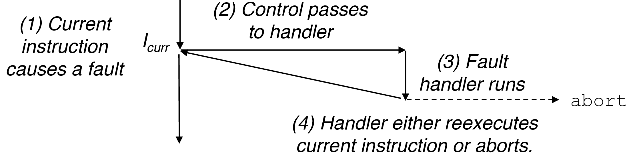 | fault | potentially recoverable error | sync | might return to current instruction |