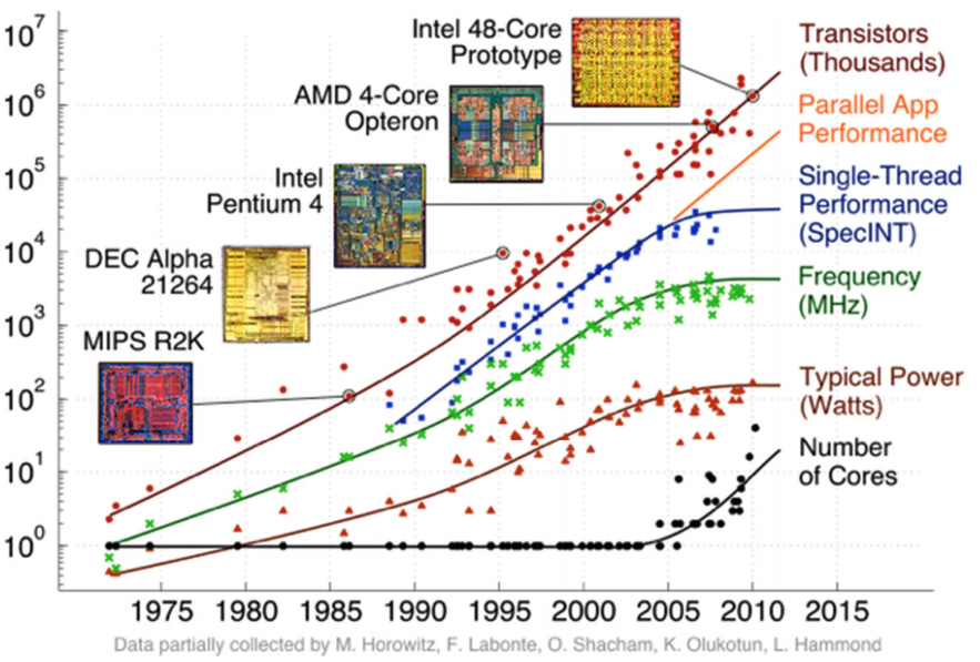 - Since 2000, transistors too small to shrink further (just a few molecules thick)