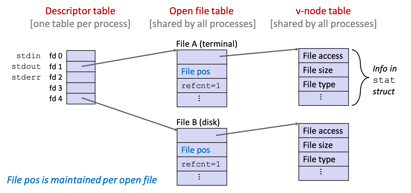 - Each process created by a Linux shell begins life with three open files associated with a terminal: