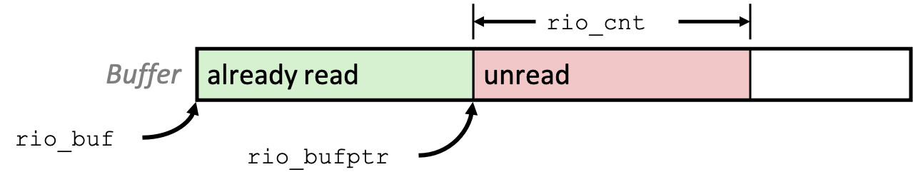 typedef struct { int rio_fd; /* descriptor for this internal buf */ int rio_cnt; /* unread bytes in internal buf */ char *rio_bufptr; /* next unread byte in internal buf */ char rio_buf[RIO_BUFSIZE]; /* internal buffer */ } rio_t;